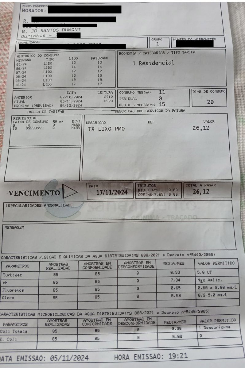 A última conta emitida pela SAE (Superintendência de Água e Esgoto), antiga responsável pelos serviços, foi referente ao consumo dos meses de setembro e outubro, incluindo a taxa de lixo. Essa fatura foi gerada pela Prefeitura de Ourinhos e teve vencimento em novembro.