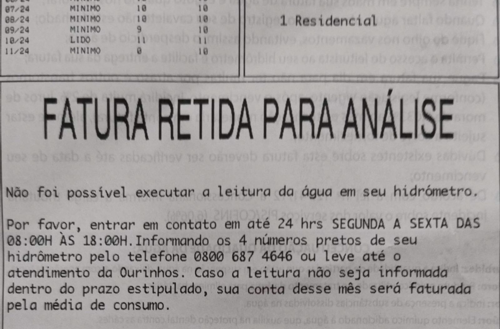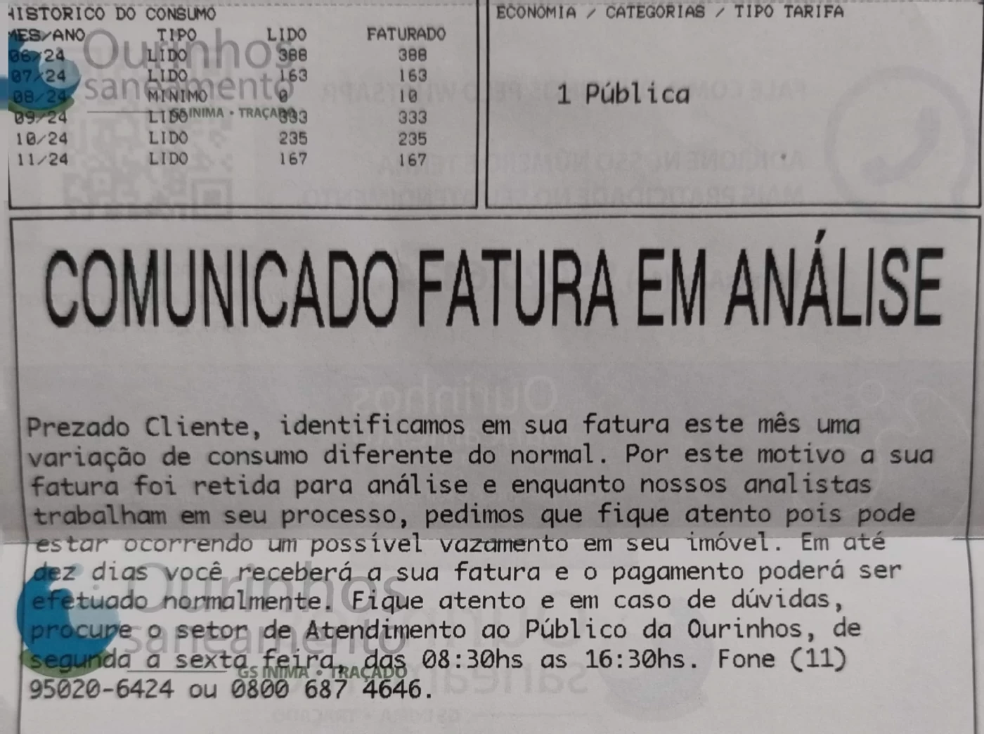 As faturas com os dizeres “comunicado fatura em análise” ou “fatura retida para análise” indicam que a concessionária está verificando possíveis oscilações no consumo registrado. Isso ocorre porque, durante a mudança de gestão, a empresa ajustou o sistema para garantir que o consumo informado seja preciso.