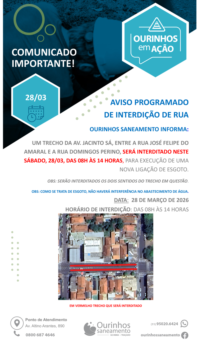 De acordo com o comunicado, o serviço ocorrerá das 8h às 14h e envolverá a interdição de um trecho da Avenida Jacinto Sá, entre as ruas José Felipe do Amaral e Domingos Perino. A intervenção será necessária para a execução de uma nova ligação de esgoto.