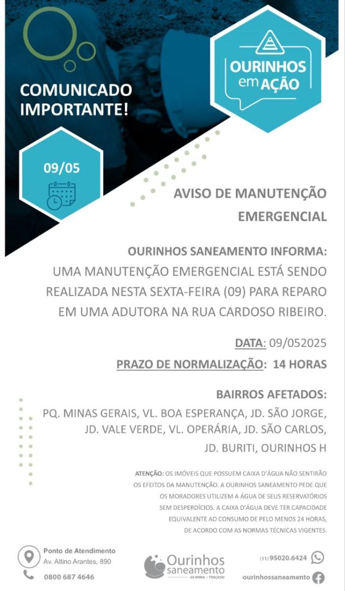 A concessionária Ourinhos Saneamento informou que realiza, nesta sexta-feira, 9 de maio de 2025, uma manutenção emergencial na Rua Cardoso Ribeiro, em Ourinhos, devido ao rompimento de uma tubulação da rede de abastecimento.