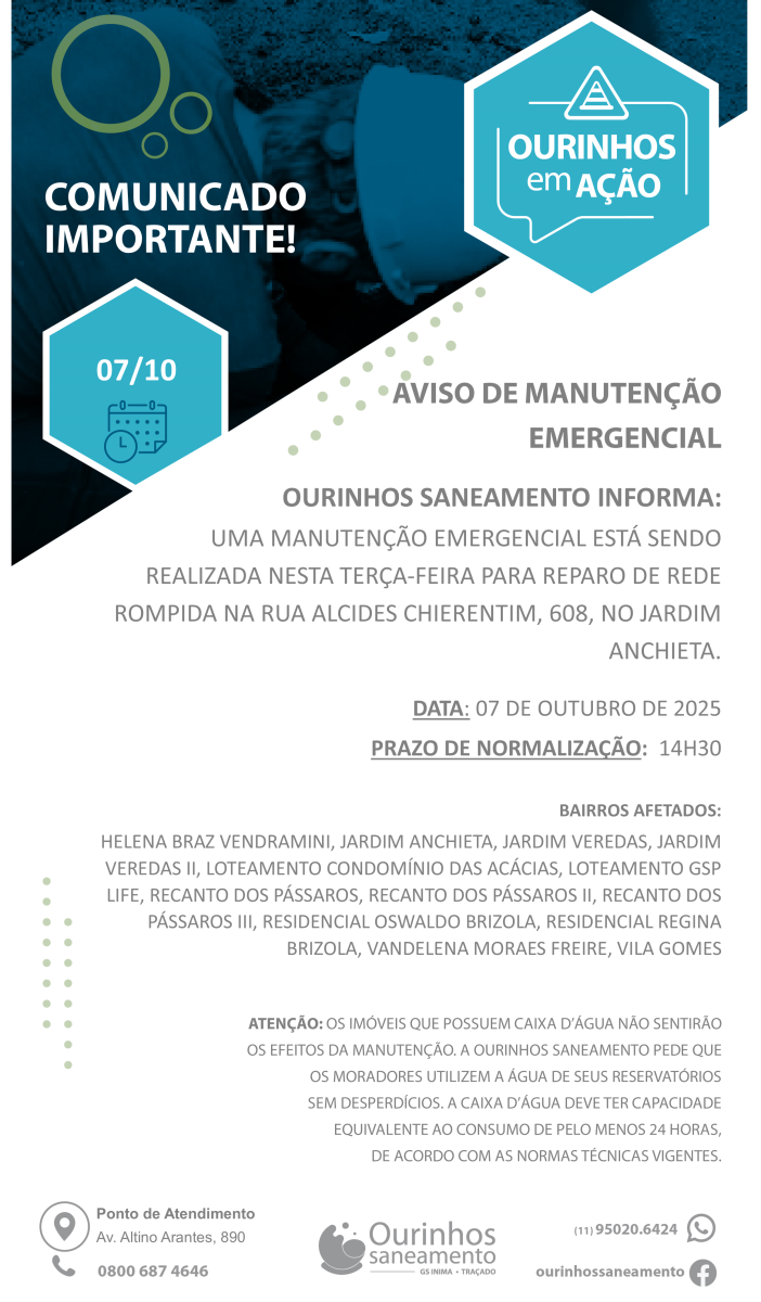 A Ourinhos Saneamento informou que realiza, nesta terça-feira (7 de outubro de 2025), uma manutenção emergencial para o reparo de uma rede de água rompida na Rua Alcides Chierentim, nº 608, no Jardim Anchieta, em Ourinhos (SP).