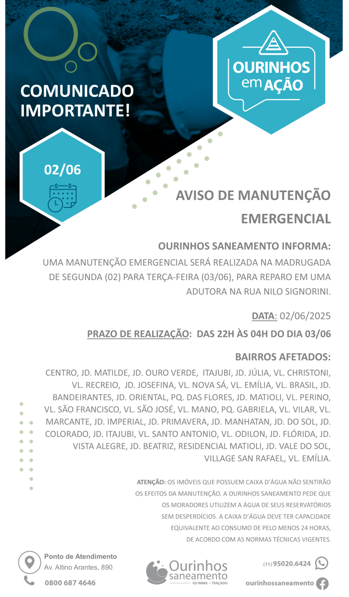 Mais informações podem ser obtidas pelos canais de atendimento da Ourinhos Saneamento: