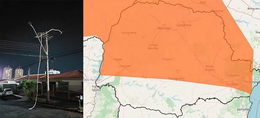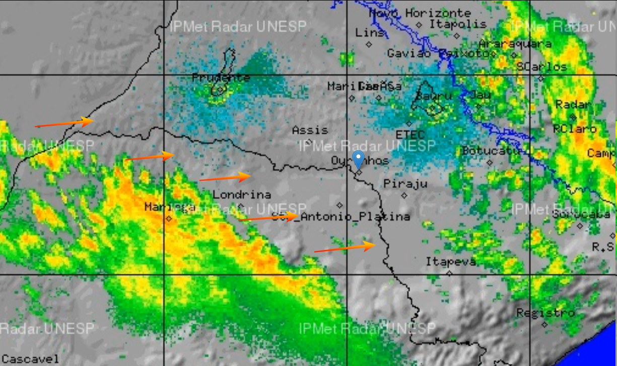 Os radares do IPMet/Bauru mostravam, por volta das 7h30, a frente fria já atuando no Paraná, com passagem por Maringá — onde os ventos chegaram a 74 km/h — e deslocando-se em direção a Londrina, com previsão de atingir o sudoeste paulista nas próximas horas.