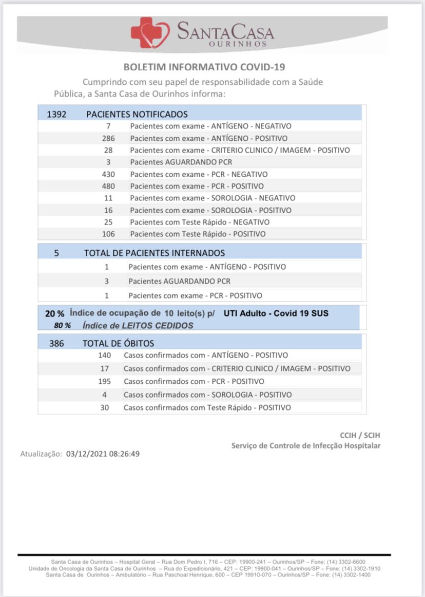 A Santa Casa de Misericórdia de Ourinhos informou, nesta sexta-feira, 3, o registro de mais uma morte devido a Covid-19 no hospital. Trata-se de um homem, morador em Ourinhos. A Prefeitura de Ourinhos ainda não divulgou informações sobre este óbito. De acordo com os últimos números, Ourinhos tem 535 mortes.