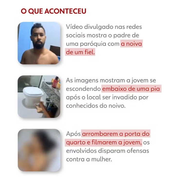 O vídeo, divulgado no início da semana, viralizou na internet e causou repercussão na cidade de pouco mais de 5 mil habitantes. As imagens mostram homens arrombando portas do quarto e do banheiro da casa paroquial após o padre se recusar a abrir. A jovem aparece chorando, escondida embaixo da pia.