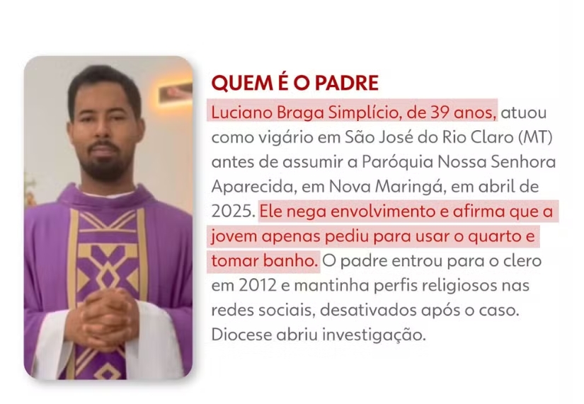 A Diocese de Diamantino, responsável pela paróquia onde o padre atua, informou em nota que abriu, na terça-feira (14), uma investigação canônica para apurar a conduta do religioso.