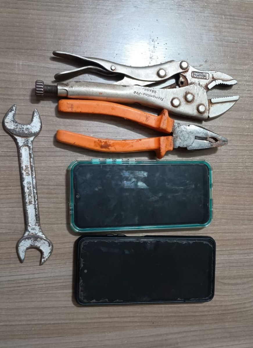 Com os suspeitos nada de ilícito foi encontrado. No entanto, dentro do veículo os policiais localizaram diversas ferramentas, como alicates, chaves e uma barra de ferro, que poderiam ser utilizadas para a prática de furto. Segundo relato dos próprios abordados aos policiais, eles pretendiam subtrair fiação elétrica e fios de cobre do pivô de irrigação existente na propriedade.