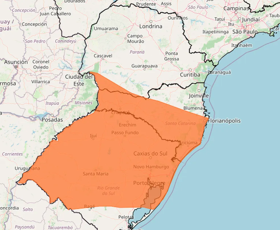 O Inmet emitiu dois alertas de tempestades para o Paraná. O primeiro, válido das 0h às 12h de sexta-feira, foca na região sudeste do estado, parte de Santa Catarina e Rio Grande do Sul, indicando a possibilidade de chuvas entre 50 mm e 100 mm por dia, ventos intensos de 60 a 100 km/h e queda de granizo. O segundo alerta, para o restante do Paraná e Santa Catarina, prevê chuvas de até 50 mm por dia, ventos de até 60 km/h e possível queda de granizo, com risco mais baixo de cortes de energia elétrica e estragos em plantações, árvores e alagamentos.