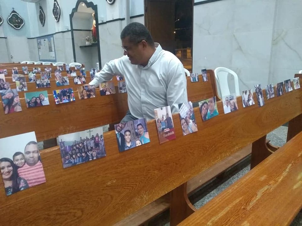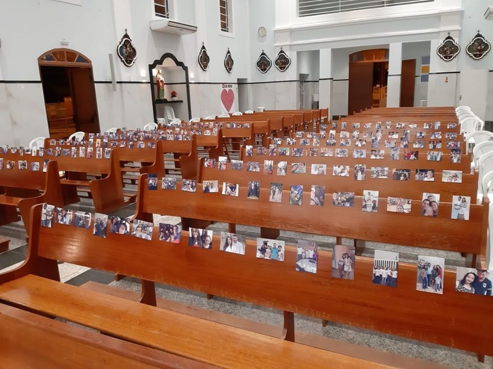 Na quarta-feira (25), colaboradores espalharam fotos impressas dos frequentadores da paróquia nos bancos da igreja e tornaram a missa, transmitida pela internet, um momento emocionante para os padres e fiéis.