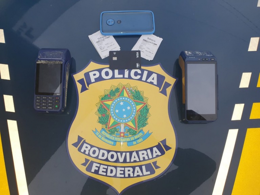 Durante as buscas nas bagagens, os policiais encontraram duas máquinas de cartão e comprovantes de transações. Quando indagado, o passageiro assumiu que usava as máquinas para a prática de estelionato.