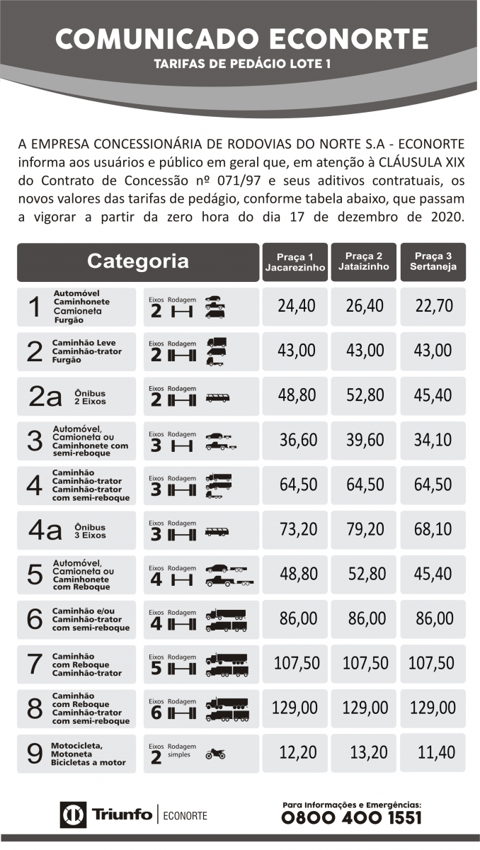 A concessionária Econorte reajustou os preços das tarifas de pedágio nas praças de Jataizinho, Sertaneja e Jacarezinho, no norte do Paraná, nesta quinta-feira (17). Em Jacarezinho, na divisa com Ourinhos, o pedágio subiu dos atuais R$22,70 para R$24,40, quase R$2 de diferença. Jataizinho continua sendo o mais caro, pulando de R$24,60 para R$26,40 e o mais barato é o de Sertaneja, que subiu de R$21,10, para R$22,70.