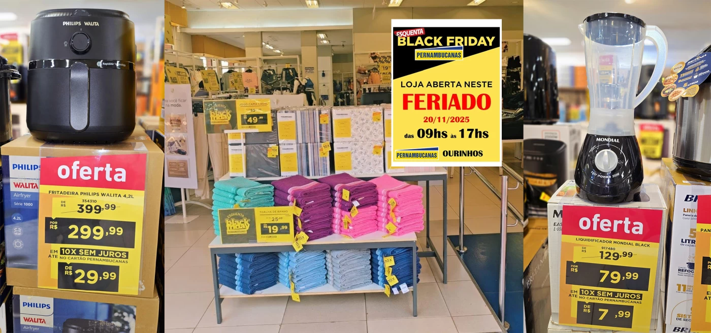 A loja Pernambucanas de Ourinhos estará aberta neste feriado da Consciência Negra, quinta-feira, 20 de novembro, das 9h às 17h, oferecendo ao público a oportunidade de aproveitar as promoções do Esquenta Black Friday, com descontos em produtos de cama, banho e eletroportáteis.
