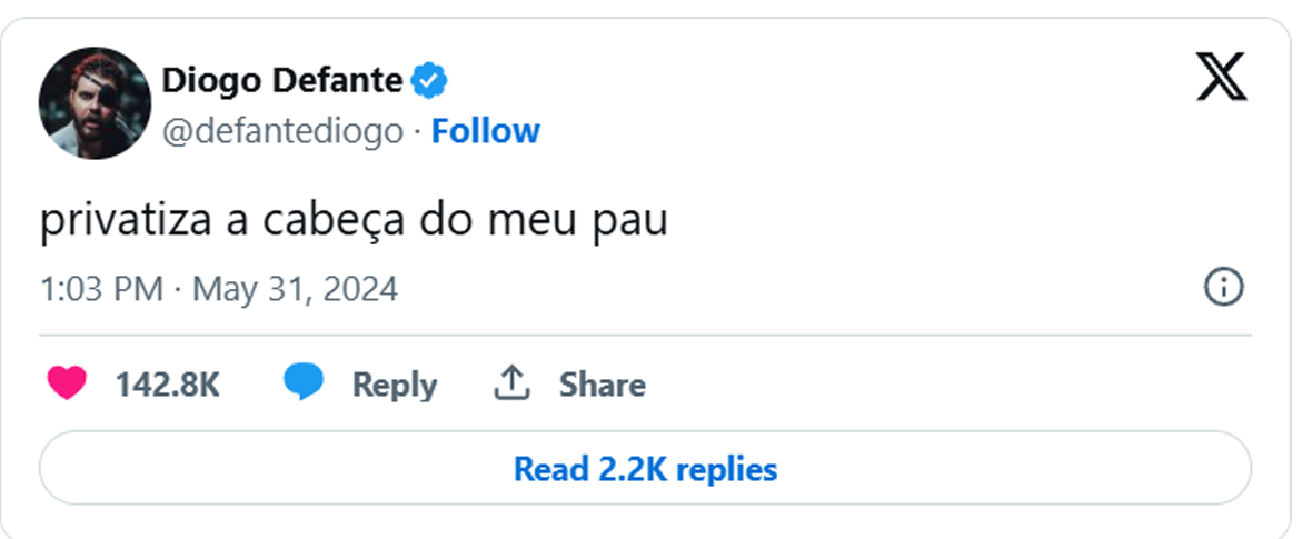 Diogo Defante, humorista conhecido por seus comentários irreverentes, se manifestou no X com uma mensagem direta: "Privatiza a cabeça do meu p**". A declaração inflamou ainda mais a discussão, levando Neymar a responder nos stories do Instagram.