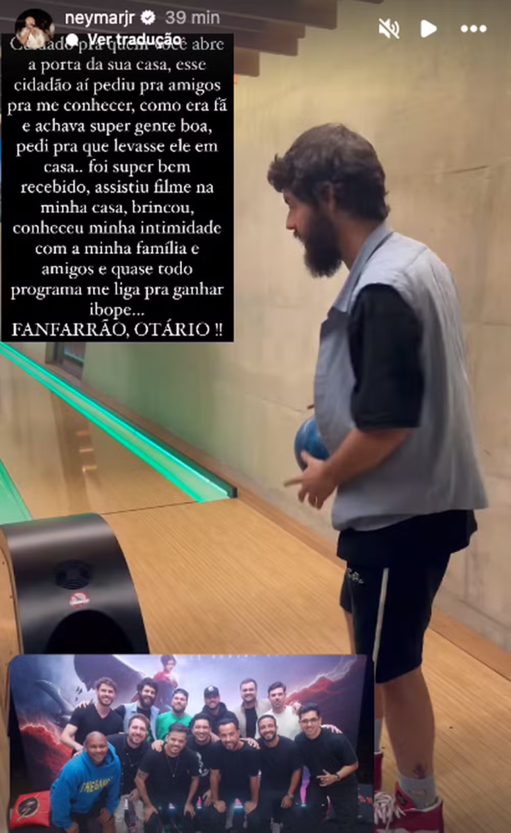 Em seu perfil no Instagram, Neymar postou um vídeo de Defante jogando boliche, acompanhado de um texto contundente: "Cuidado pra quem você abre a porta da sua casa. Esse cidadão aí pediu pra amigos pra me conhecer, como era fã e achava super gente boa, pedi pra que levasse ele em casa.. foi super bem recebido, assistiu filme na minha casa, brincou, conheceu minha intimidade com a minha família e amigos e quase todo programa me liga pra ganhar ibope... FANFARRÃO, OTÁRIO!!" Pouco tempo depois, Neymar apagou o post.