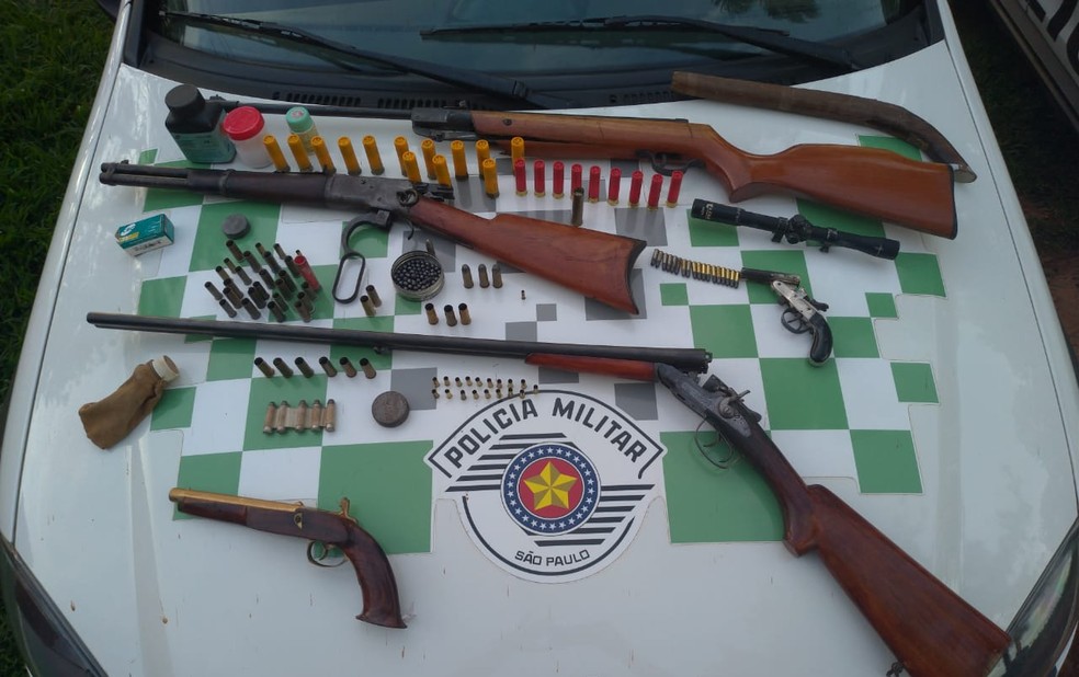 Um homem foi preso com armas, munições e ave em cativeiro no sítio onde mora, em Piraju (SP) (59 km de Ourinhos), na noite de terça-feira (5).