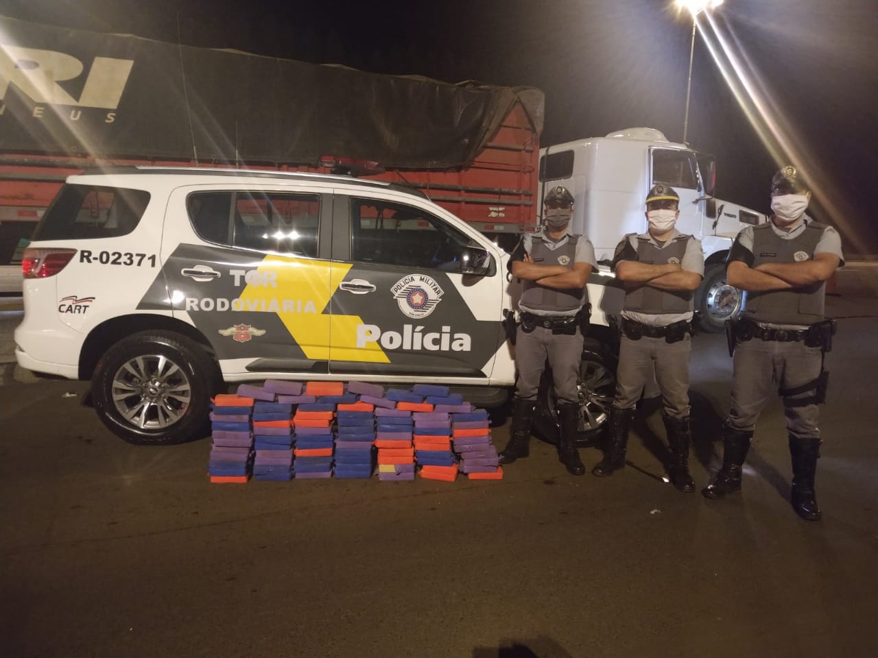 “A equipe TOR do 2BPRv da 3° Cia, durante fiscalização "Operação Corpus Christi" com vistas ao tráfico de drogas e demais ilícitos penais abordou o veículo marca Volvo, Semirreboque Randon ambas as placas de Ponta Porã/MS. Ao solicitar as documentações pertinentes notou se um certo nervosismo do condutor, o que levou a uma busca minuciosa no Semirreboque onde foi localizado em um fundo falso sob o assoalho acima da quinta roda grande quantidade de drogas (aproximadamente 80 Tabletes de pasta base de cocaína). O veículo era conduzido pelo Sr. M.S de 39 anos, informou que o destino da droga seria Bauru/SP”.