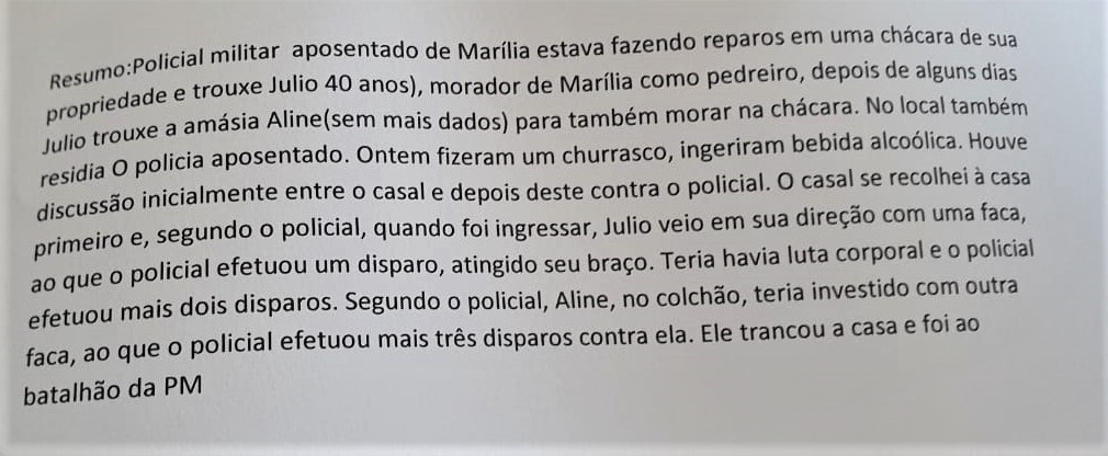 Júlio, depois de alguns dias trouxe para ficar consigo na chácara, a amásia Aline. Ontem (17) eles estavam em churrasco na chácara, houve uma discussão, Júlio teria ameaçado o policial com uma faca, os dois entraram em luta corporal, o policial efetuou, primeiro um disparo, que teria atingido o braço do pedreiro e depois mais dois disparos contra o homem. Aline também teria tentado contra o policial, com uma outra faca e o PM a matou, também com três disparos.