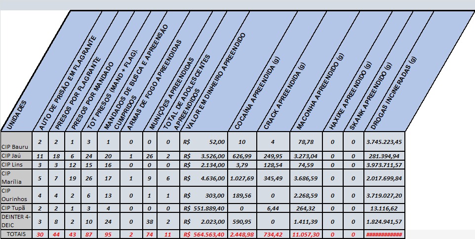 De acordo com dados divulgados pelo setor de comunicação do Deinter 4, Ourinhos realizou ao todo seis prisões, sendo quatro em flagrante. Com apreensão de mais de 189 gramas de cocaína e 2 quilos e 268 gramas de maconha. Confira o balanço preliminar na região: