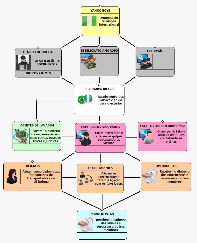 A Polícia Civil conseguiu demonstrar como a organização criminosa era estruturada: existia a figura do “Fakelover” (responsável por contatar as potenciais vítimas). Outro ramo da organização era o denominado “o oficial” que se passava por funcionário da alfandega, diplomatas e outros. Haviam também a ala dos “recrutadores” de contas e também os “operadores” (aqueles que repassavam o dinheiro rapidamente entre várias contas, após o depósito, dificultando o rastreamento). Ligados a estes, os “correntistas” (que recebiam de 7 a 10% dos valores arrecadados somente para emprestar sua conta corrente e fomentar a operacionalização, proporcionando o aumento crescente dos crimes, como eixo necessário de um mesmo mecanismo). Por fim, os agentes da lavagem de capitais cuja finalidade é “esquentar”, ou seja, tornar o dinheiro ilegal em lícitos imóveis.