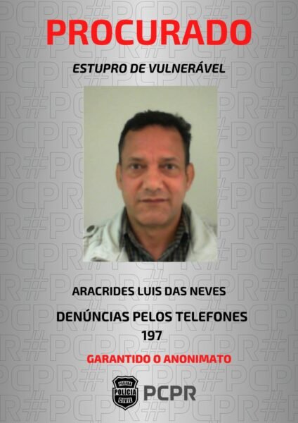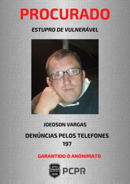 O outro foragido é Joedson Vargas, de 40 anos. Ele é suspeito de estupro de vulnerável contra um menino de apenas 7 anos, que é familiar de sua esposa. Um laudo pericial apontou o crime sofrido pela criança.