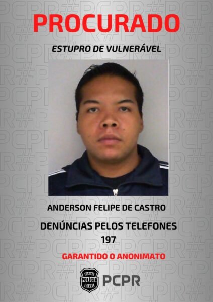 Anderson Felipe de Castro, de 30 anos, é suspeito de estupro e armazenamento de pornografia infantil contra uma familiar de sua esposa. Conforme apurado, os crimes ocorriam desde de 2016 e foram registrados em 2018. Na época dos fatos, a vítima tinha 13 anos. Ele também é investigado por ter abusado sexualmente de duas sobrinhas de 11 e 12 anos.