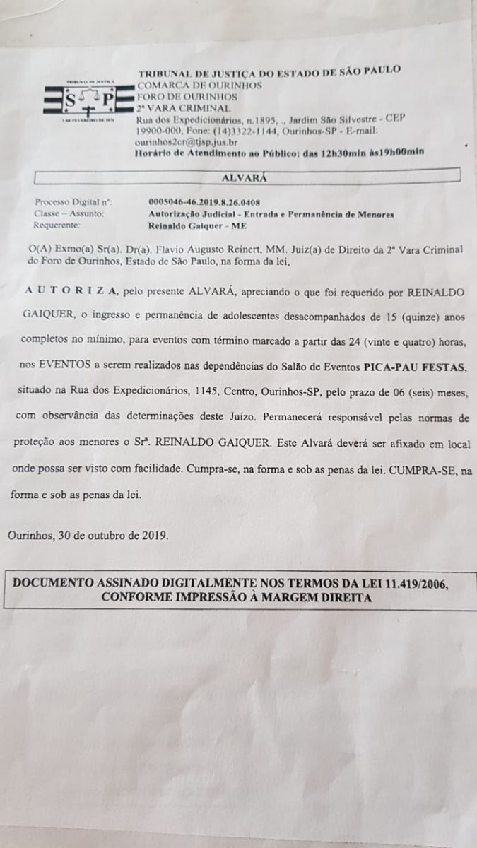 Ainda de acordo com ele, não tem tráfico de drogas nos eventos, pois há revista com segurança na entrada do evento e por fim ele disse que o alvará está em dia e enviou à reportagem do Passando a Régua, o alvará que foi emitido pela justiça, com a data de 30 de outubro de 2019, dentro do prazo de validade, conforme a foto abaixo: