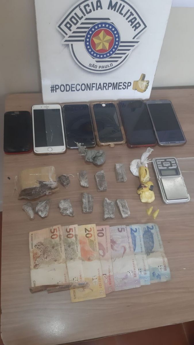 Celulares, drogas e dinheiro apreendido na festa (Foto: Divulgação 31 BPMI Ourinhos)