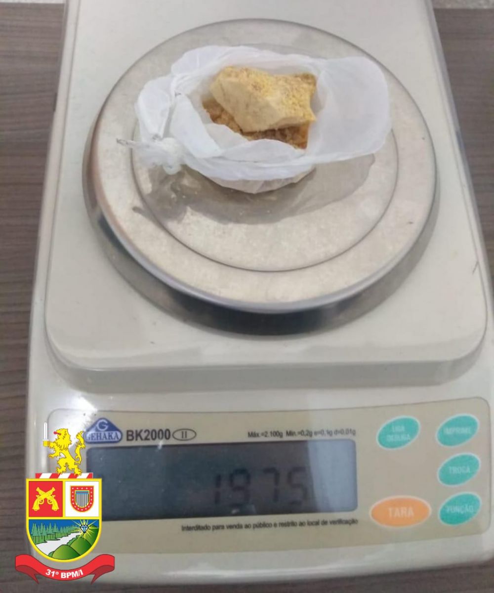 Porém, em seguida, foi abordado e durante busca pessoal foi localizado no bolso de sua bermuda uma pedra bruta embalada em um saco branco aparentando ser crack que posteriormente pesou 20 gr que se fracionadas dariam cerca de 110 pedras.