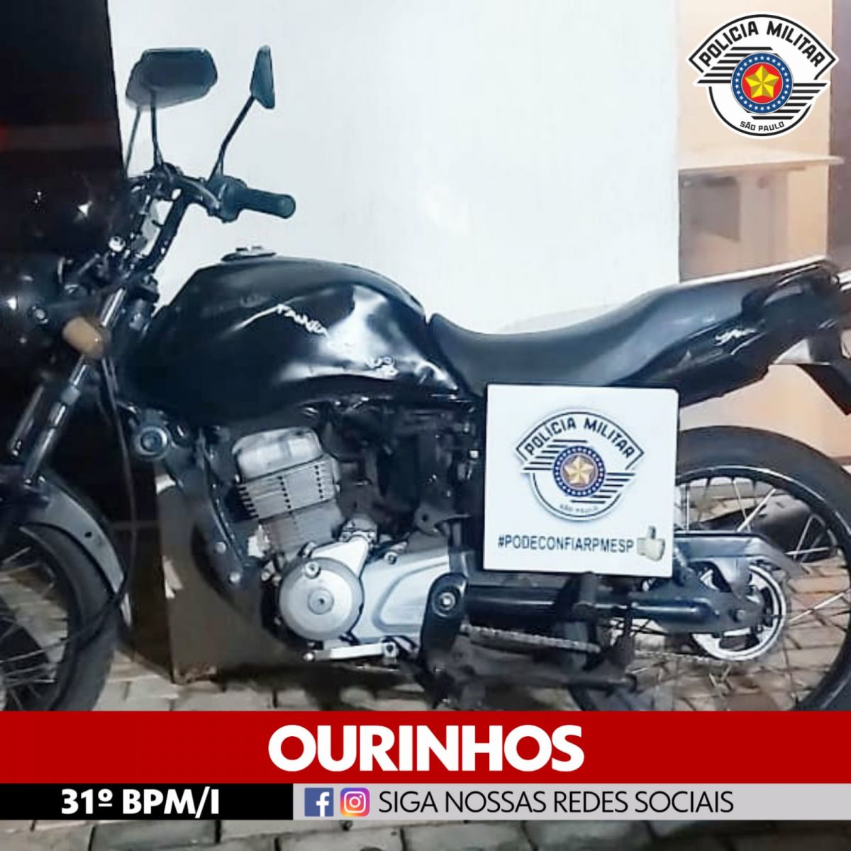Policiais militares recuperaram, na madrugada desta sexta-feira, 2, uma motocicleta que tinha sido furtada no dia 20 de setembro, em Ourinhos. A moto, uma Honda/CG 150 FAN, cinza, que estava pintada de preto, com placa de Ourinhos, estava com um adolescente detido na Rua Lázaro Amaro Moreira, no Conjunto Residencial Vandelena Moraes Freire, na região do Jardim Anchieta.