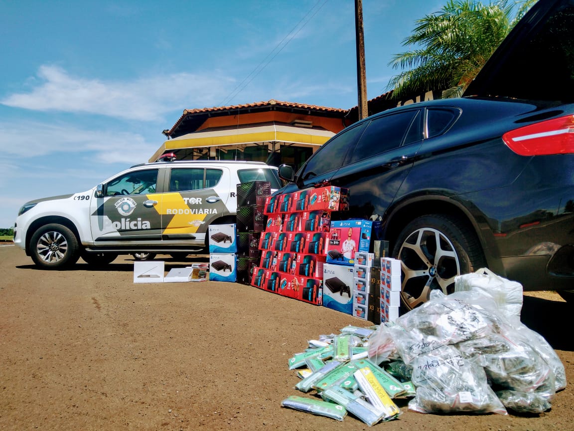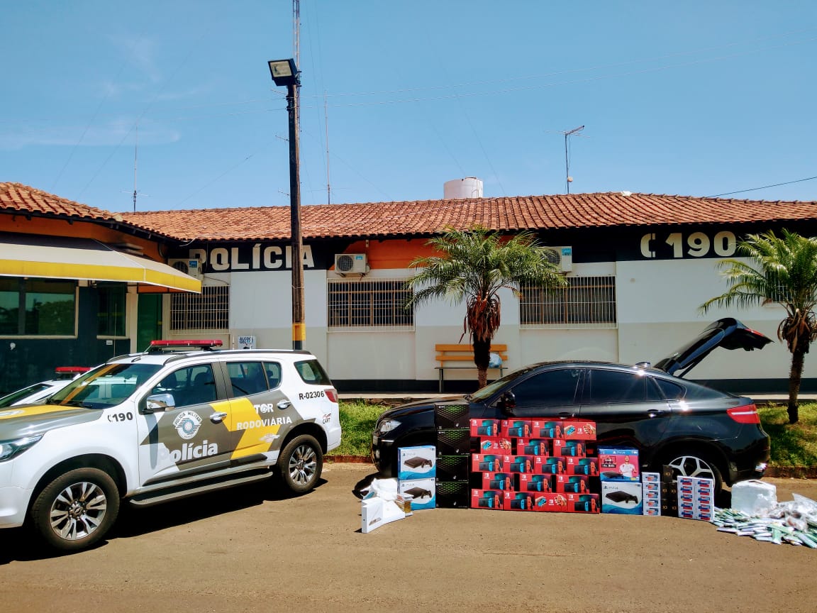 "Durante fiscalização no combate ao tráfico de drogas e demais ilícitos penais, a equipe do Policiamento Rodoviário de Ourinhos (TOR) abordou o veículo marca BMW, modelo X6, na cor preta, placas de São Paulo/SP e durante a entrevista com o condutor E.M.C de 37 anos, foi demonstrado certo nervosismo, fazendo com que a equipe realizasse uma busca no veículo, sendo localizado em seu interior e porta malas vários aparelhos eletrônicos oriundos do Paraguai sem a devida documentação fiscal".