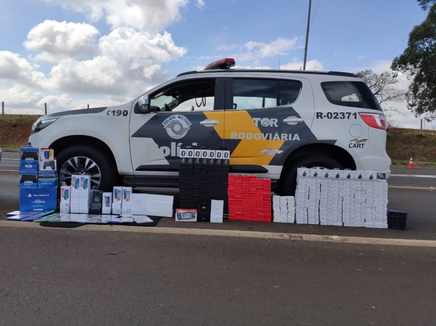 Policiais rodoviárias apreenderam na manhã desta terça-feira, 20, uma grande quantidade de produtos contrabandeados, diversos eletrônicos oriundos do Paraguai, que estavam em um veículo abordado, no km 301, na SP-225, em Santa Cruz do Rio Pardo (33 km de Ourinhos).