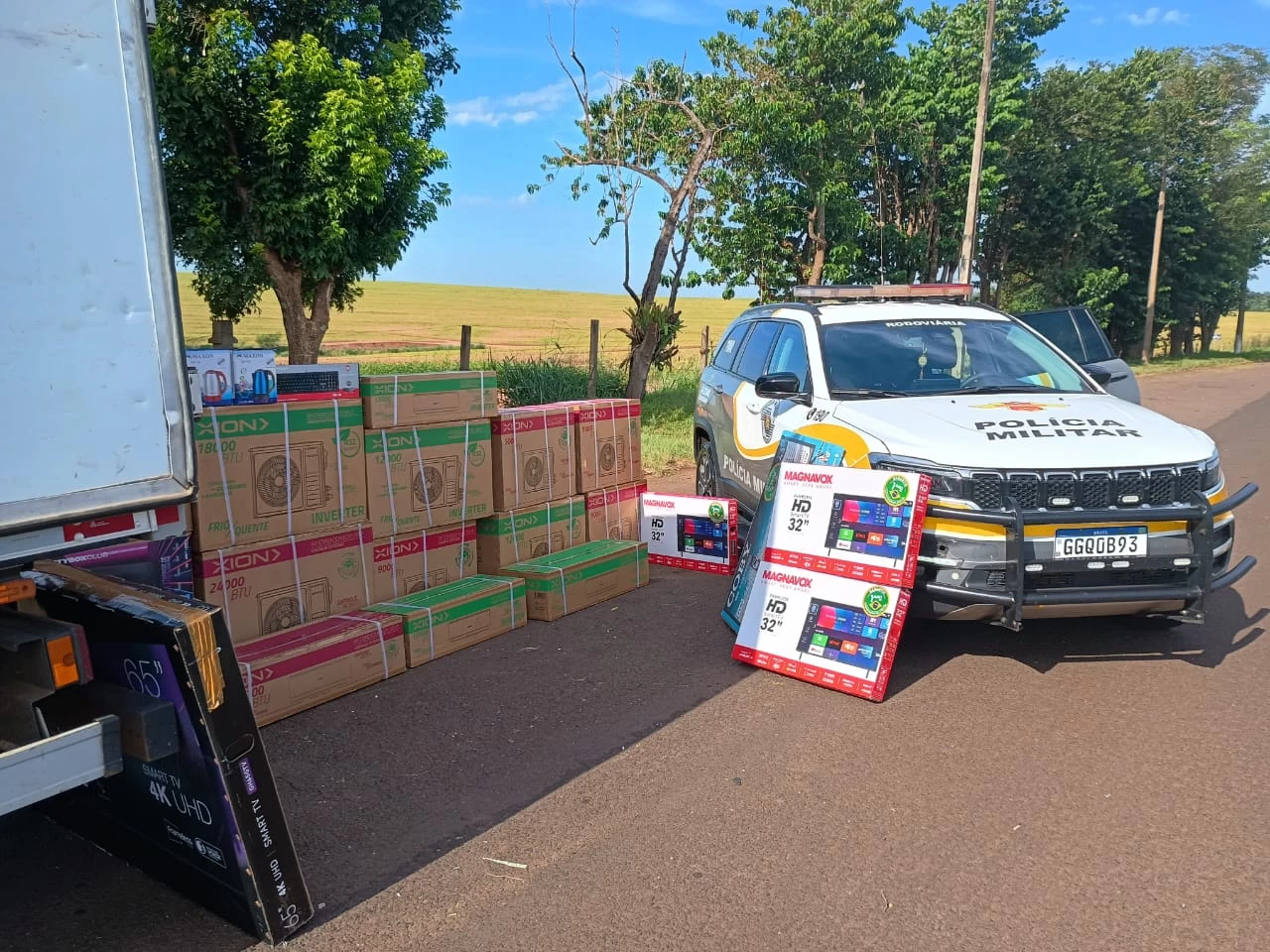 Os policiais abordaram um caminhão Iveco Tector 11-190 e, durante a vistoria, localizaram diversos produtos importados sem comprovação fiscal. Entre os itens apreendidos estavam: