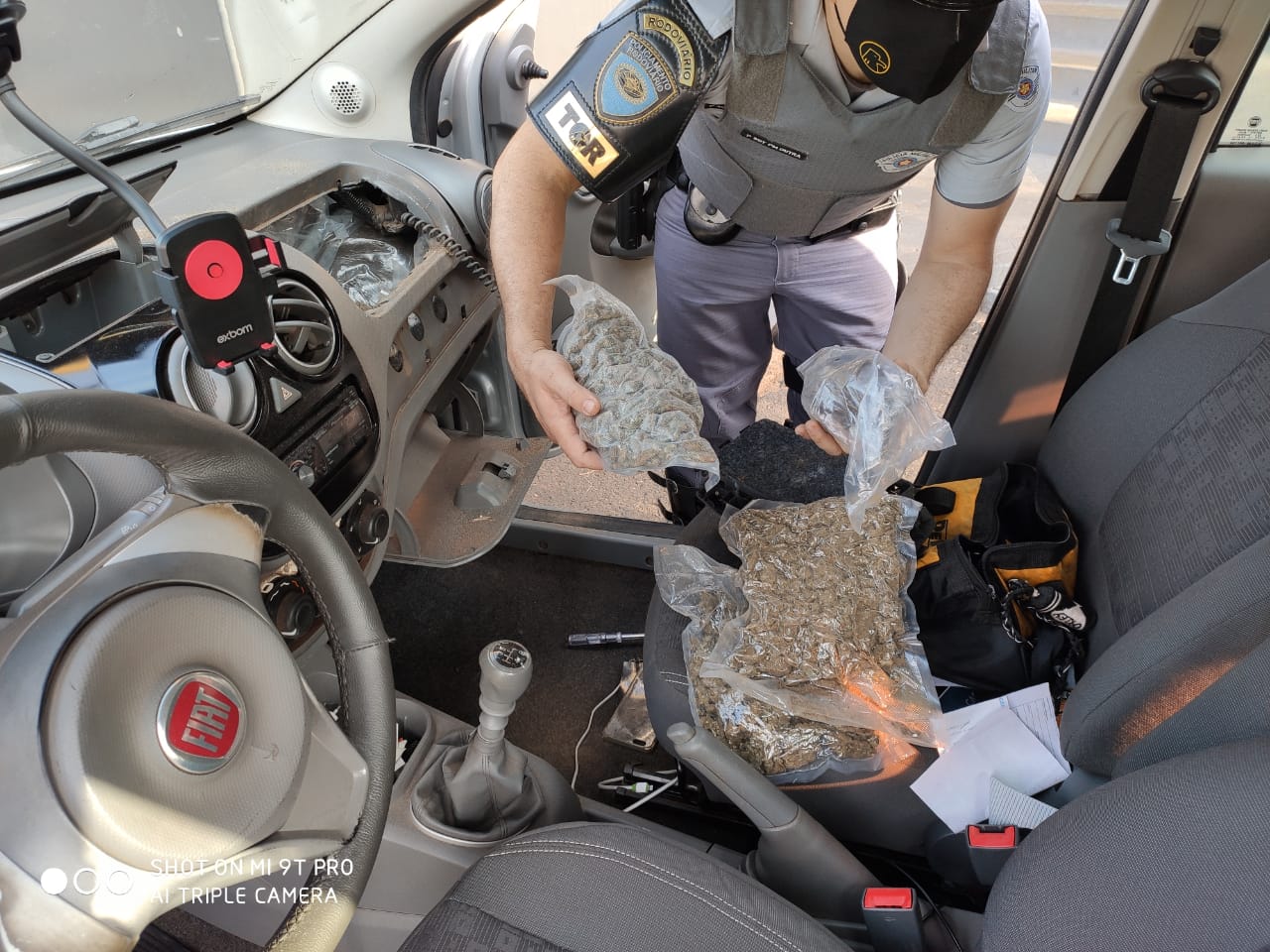 "Equipe TOR "C" da 3Cia do 2BPRv durante patrulhamento com vistas ao tráfico de drogas e demais ilícitos penais visualizou o veículo FIAT/Palio, placas do Mercosul, conduzido por E.P.S de 20 anos e ao realizar a abordagem notou- se um certo nervosismo do condutor, o que levou a uma busca minuciosa no interior do veículo, vindo a localizar escondido em um fundo falso no painel, grande quantidade de drogas (haxixe e skunk). Ocorrência em andamento".