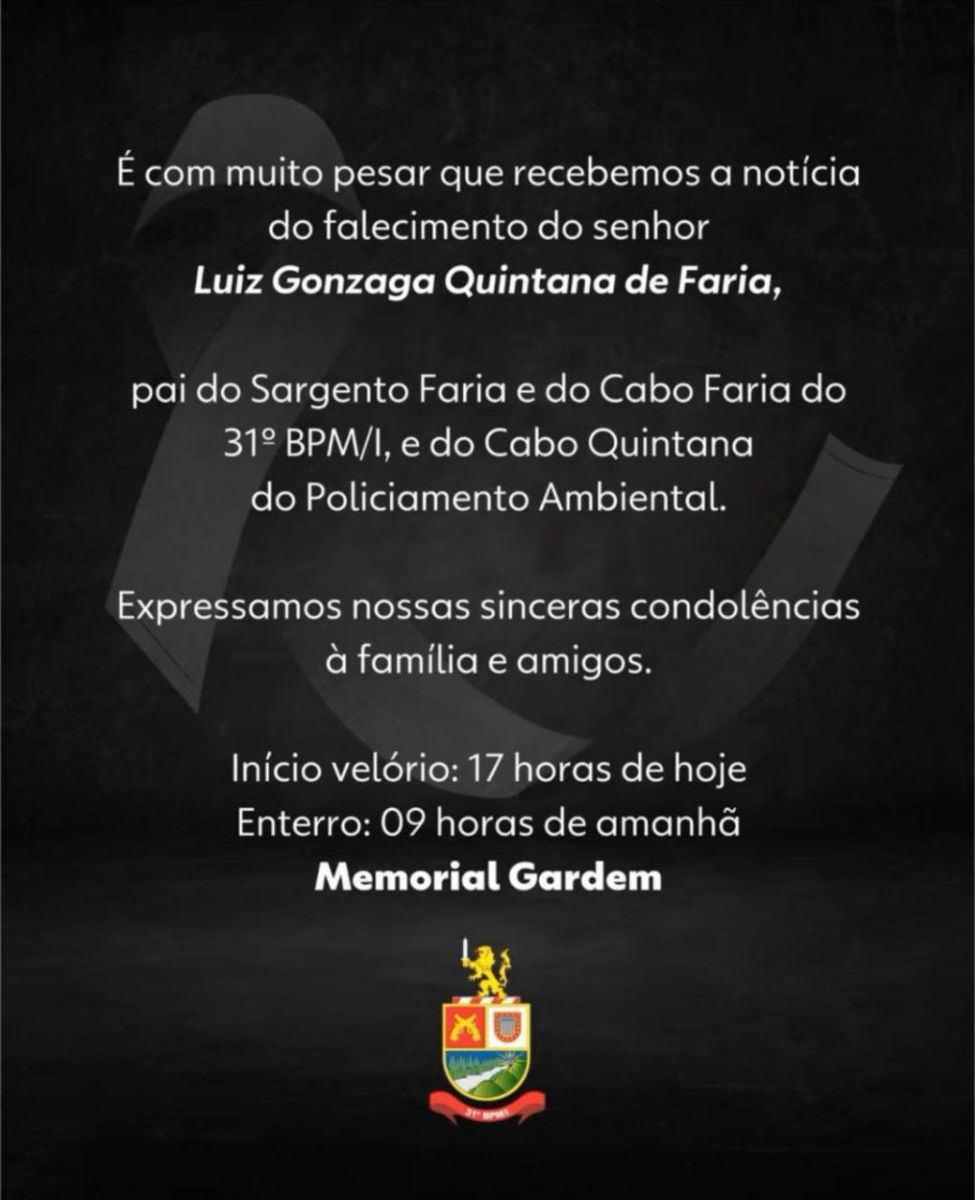 O 31º BPM/I e o Policiamento Ambiental manifestaram solidariedade aos familiares e reforçaram o reconhecimento pelo serviço prestado por Luiz Gonzaga e pelo compromisso de sua família com a segurança pública na região.