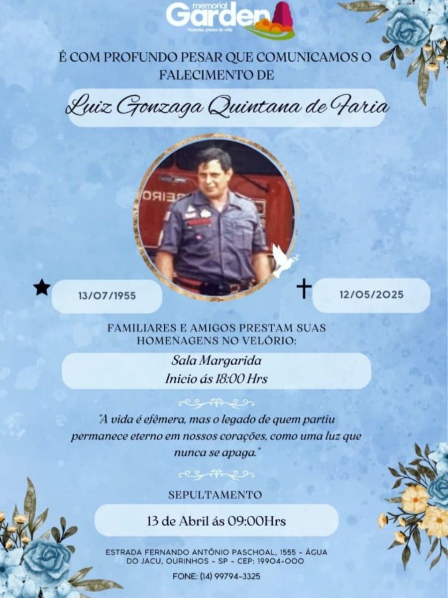 Faleceu nesta segunda-feira, 12, em Ourinhos (SP), o policial militar da reserva Luiz Gonzaga Quintana de Faria, aos 69 anos. O velório acontece a partir das 18h de hoje, no Memorial Garden de Ourinhos, onde também será realizado o sepultamento, nesta terça-feira, 13, às 9h.