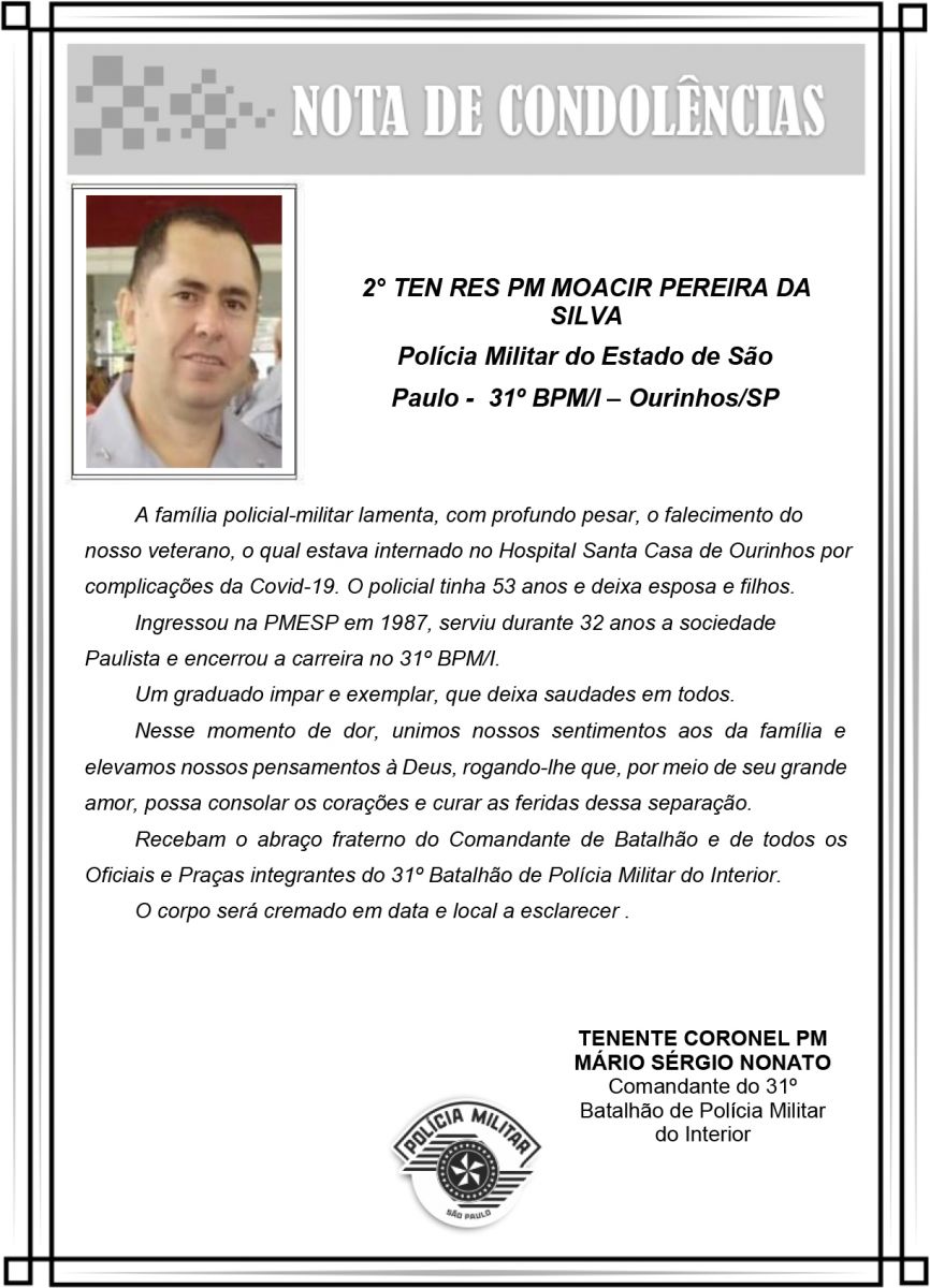 O policial militar, 2º Tenente, veterano da Polícia Militar, Moacir Pereira da Silva, faleceu aos 53 anos, neste domingo, 9, após complicações da Covid-19, em Ourinhos. Moacir, que encerrou sua carreira na PM no 31º Batalhão da Polícia Militar do Interior em Ourinhos, estava internado na Santa Casa de Misericórdia da cidade.