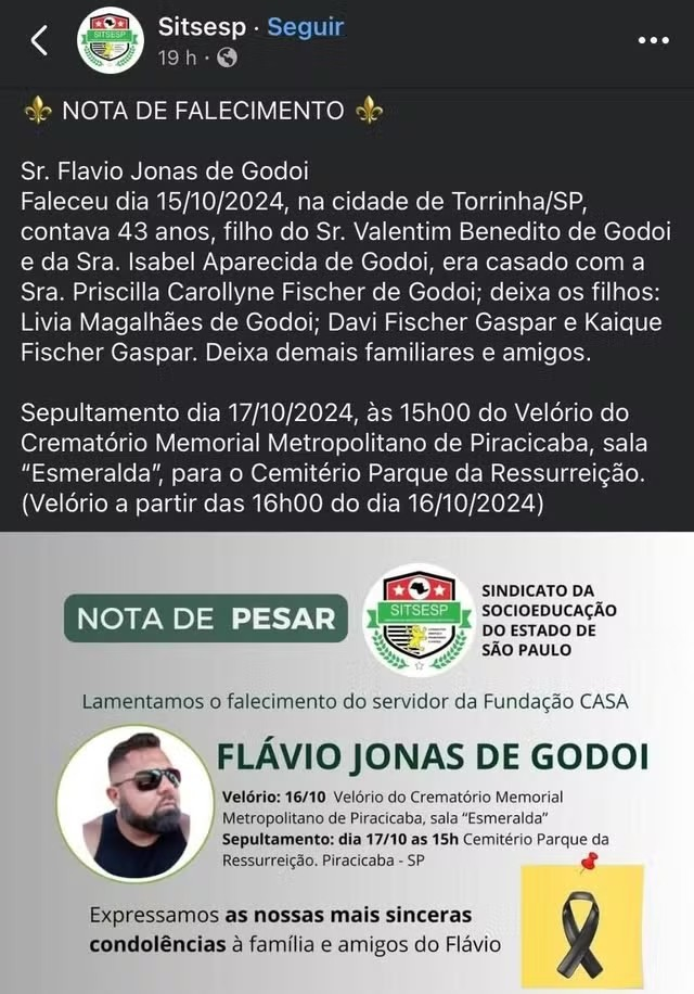Funeral Flávio Jonas de Godoi foi velado nesta quinta-feira, no Velório do Crematório Memorial Metropolitano de Piracicaba, na sala “Esmeralda”. O sepultamento ocorreu no Cemitério Parque da Ressurreição às 15h. Flávio deixa esposa e três filhos, e sua morte tem gerado grande comoção entre amigos e familiares, que expressam pesar nas redes sociais.