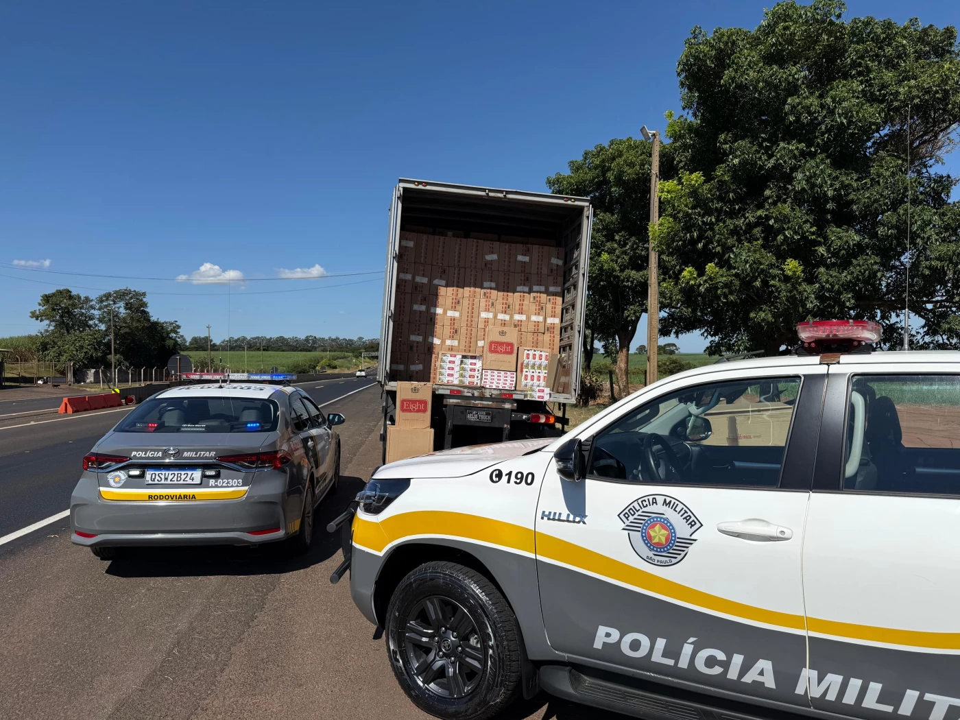 Durante a abordagem a um caminhão, os policiais realizaram vistoria no compartimento de carga e localizaram caixas de brinquedos posicionadas próximas à porta do baú. No entanto, o restante do veículo estava carregado com cigarros de origem paraguaia, sem documentação fiscal.