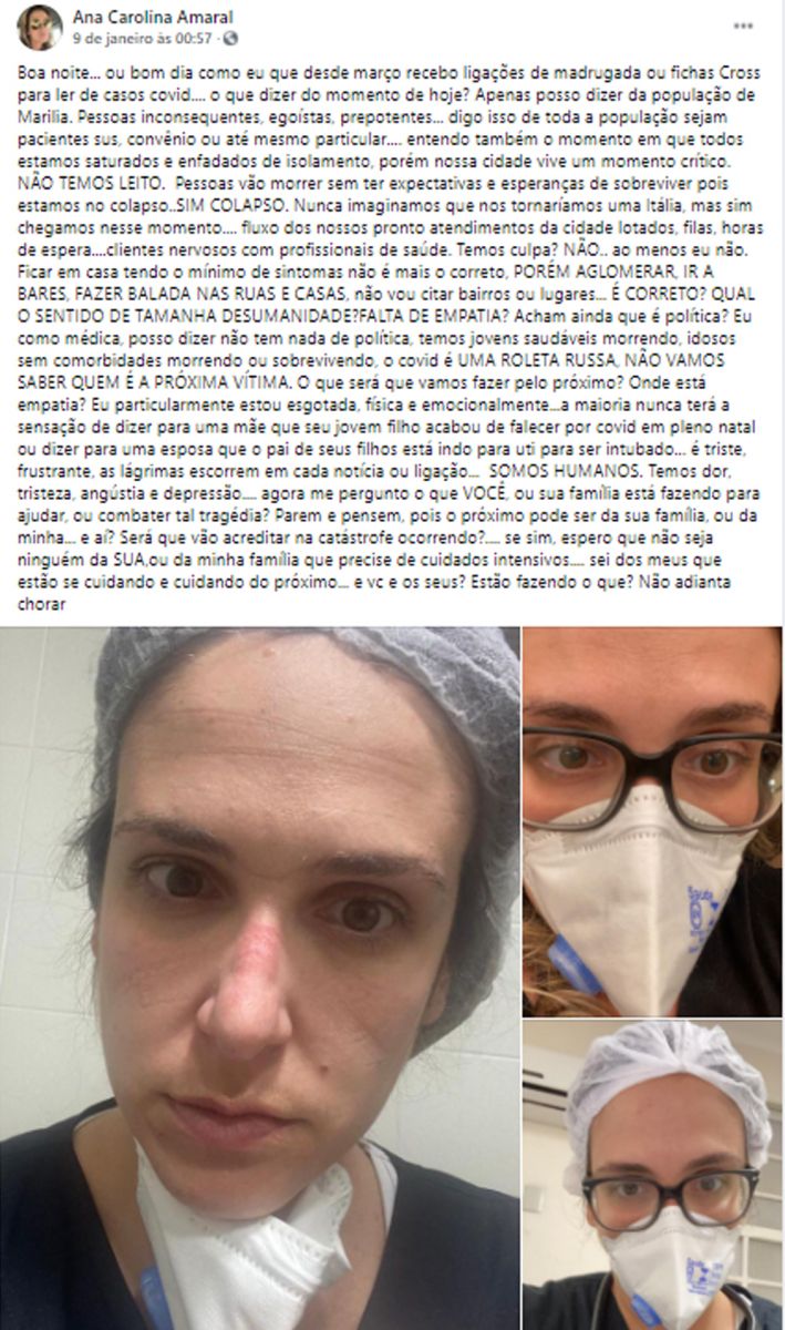 "Boa noite... ou bom dia como eu que desde março recebo ligações de madrugada ou fichas Cross para ler de casos covid.... o que dizer do momento de hoje? Apenas posso dizer da população de Marilia. Pessoas inconsequentes, egoístas, prepotentes... digo isso de toda a população sejam pacientes sus, convênio ou até mesmo particular.... entendo também o momento em que todos estamos saturados e enfadados de isolamento, porém nossa cidade vive um momento crítico. NÃO TEMOS LEITO. Pessoas vão morrer sem ter expectativas e esperanças de sobreviver pois estamos no colapso..SIM COLAPSO. Nunca imaginamos que nos tornaríamos uma Itália, mas sim chegamos nesse momento.... fluxo dos nossos pronto atendimentos da cidade lotados, filas, horas de espera....clientes nervosos com profissionais de saúde. Temos culpa? NÃO.. ao menos eu não. Ficar em casa tendo o mínimo de sintomas não é mais o correto, PORÉM AGLOMERAR, IR A BARES, FAZER BALADA NAS RUAS E CASAS, não vou citar bairros ou lugares... É CORRETO? QUAL O SENTIDO DE TAMANHA DESUMANIDADE?FALTA DE EMPATIA? Acham ainda que é política? Eu como médica, posso dizer não tem nada de política, temos jovens saudáveis morrendo, idosos sem comorbidades morrendo ou sobrevivendo, o covid é UMA ROLETA RUSSA, NÃO VAMOS SABER QUEM É A PRÓXIMA VÍTIMA. O que será que vamos fazer pelo próximo? Onde está empatia? Eu particularmente estou esgotada, física e emocionalmente...a maioria nunca terá a sensação de dizer para uma mãe que seu jovem filho acabou de falecer por covid em pleno natal ou dizer para uma esposa que o pai de seus filhos está indo para uti para ser intubado... é triste, frustrante, as lágrimas escorrem em cada notícia ou ligação... SOMOS HUMANOS. Temos dor, tristeza, angústia e depressão.... agora me pergunto o que VOCÊ, ou sua família está fazendo para ajudar, ou combater tal tragédia? Parem e pensem, pois o próximo pode ser da sua família, ou da minha... e aí? Será que vão acreditar na catástrofe ocorrendo?.... se sim, espero que não seja ninguém da SUA,ou da minha família que precise de cuidados intensivos.... sei dos meus que estão se cuidando e cuidando do próximo... e vc e os seus? Estão fazendo o que? Não adianta chorar".