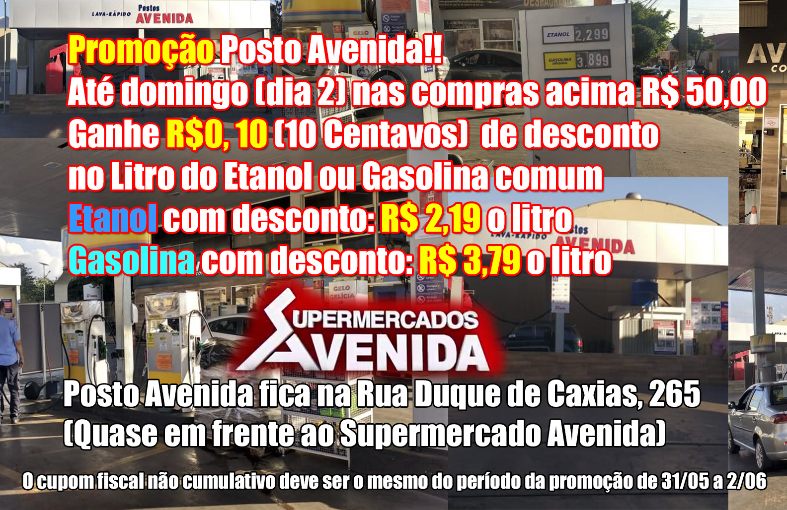O posto de combustíveis do Supermercado Avenida está com uma promoção imbatível para este final de semana. Para quem frequentar o Supermercado Avenida e fizer compras acima de R$50,00 terá o desconto de R$0,10 (10 centavos) no litro de Etanol e Gasolina comum. Com a promoção os valores chegarão em R$ 2,19 o litro do Etanol e R$ 3,79 o litro da Gasolina.