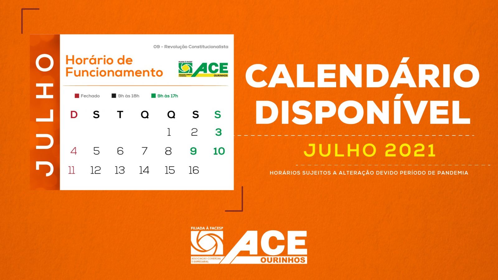 Comércio de Ourinhos funciona normalmente na sexta-feira (9) e no sábado (10) estará aberto até às 17h, conforme calendário da ACE (Associação Comercial e Empresarial de Ourinhos):
