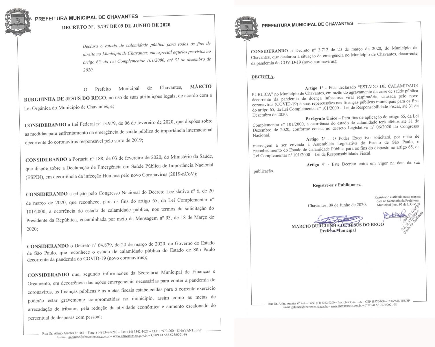 O decreto assinado pelo prefeito Márcio Burguinha (MDB) tem uma redação padrão de todos os decretos feitos por municípios do país desde o inicio da pandemia do novo coronavírus e estabelecerá ao município de Chavantes facilidades em angariar recursos federais e estaduais, e contratar, por exemplo, sem a necessidade de licitação. (Confira abaixo a publicação).