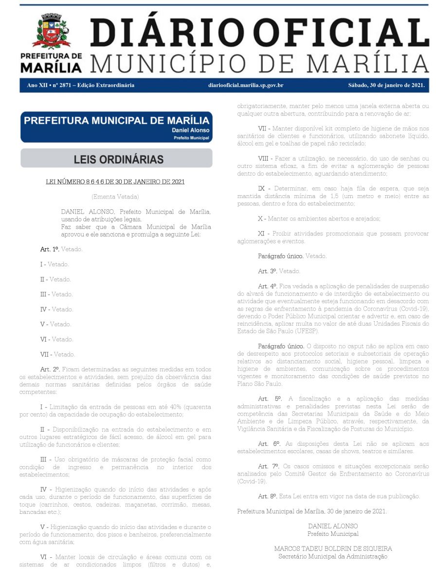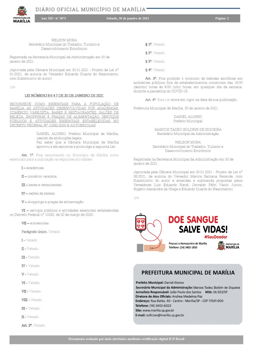 O prefeito de Marília (90 km de Ourinhos), Daniel Alonso (PSDB), sancionou neste sábado, 30, duas Leis Municipais, que foram aprovadas, também neste sábado, na Câmara Municipal de Ourinhos, que permitem a reabertura de atividades proibidas pela fase vermelha do Plano SP. (confira o vídeo de Daniel abaixo).