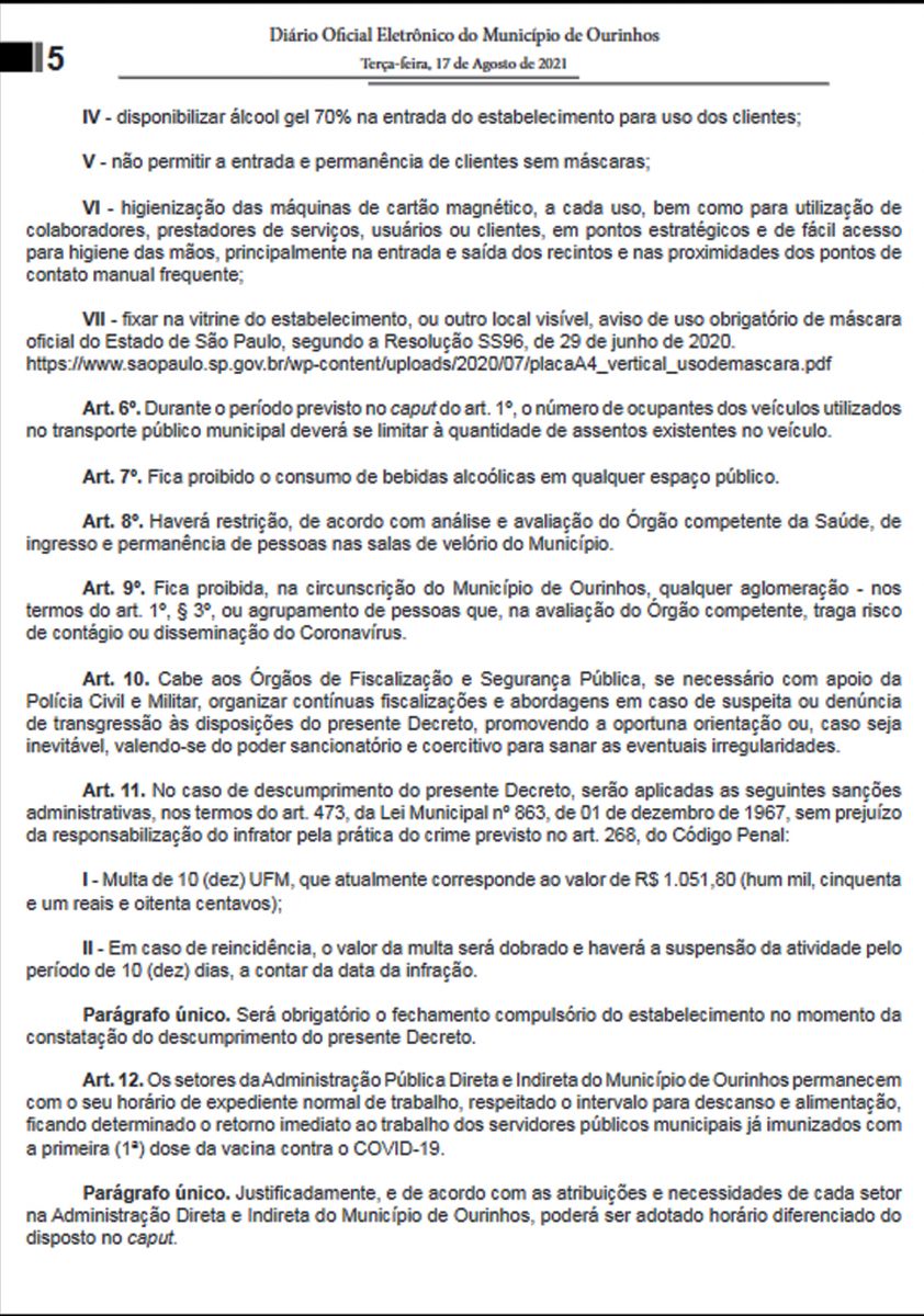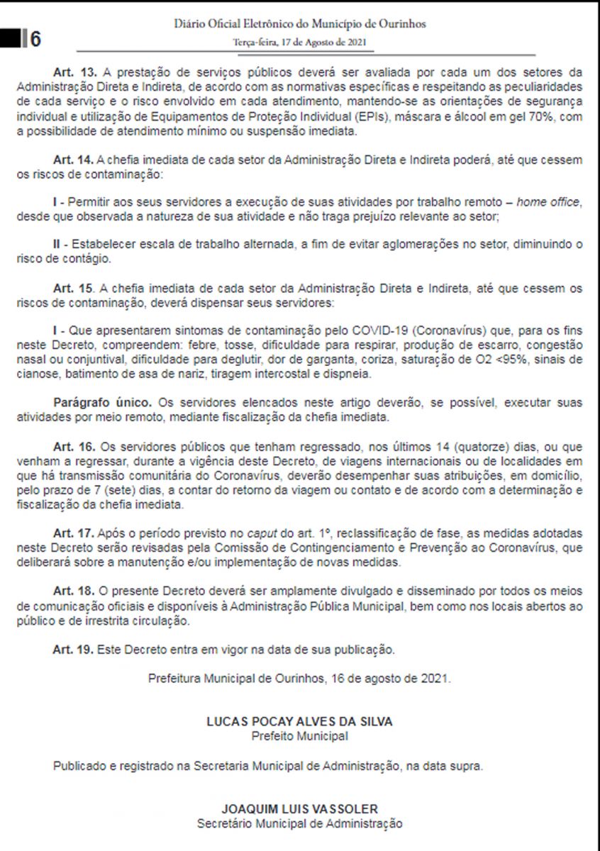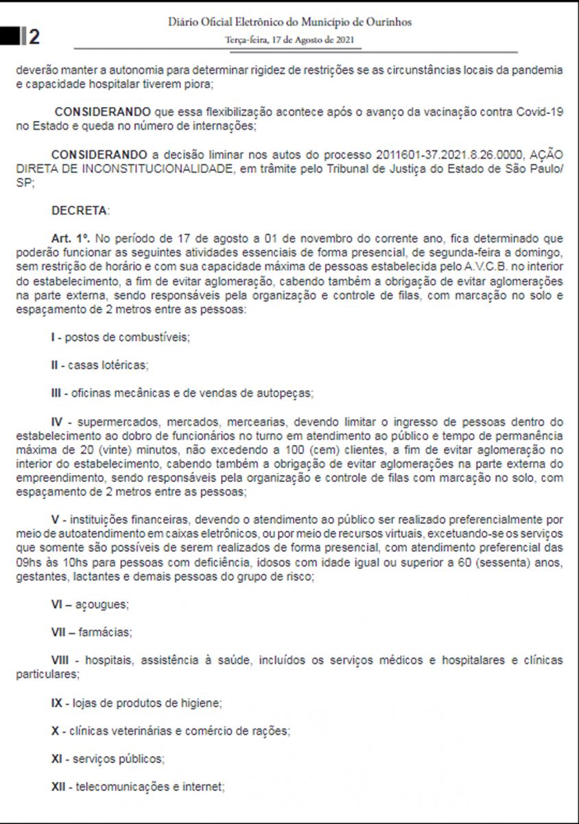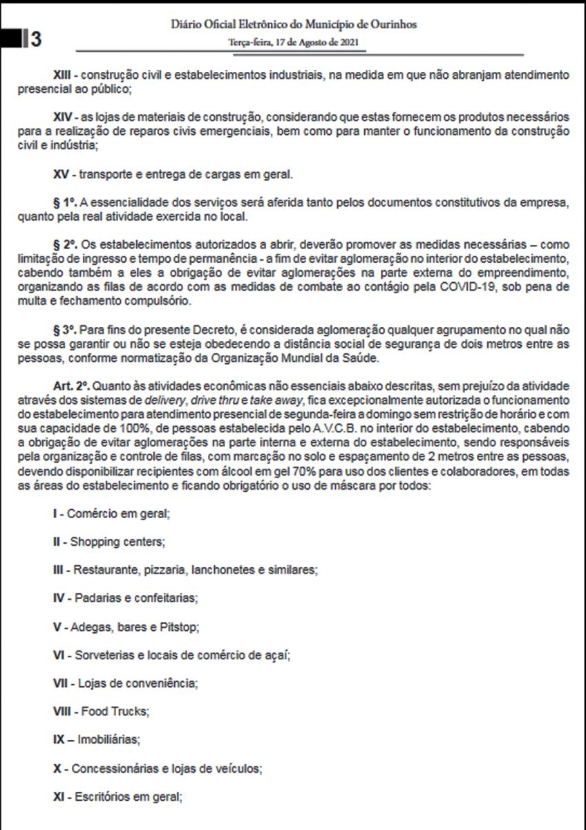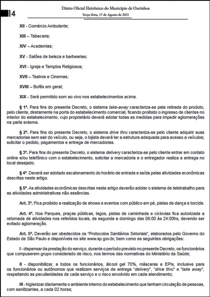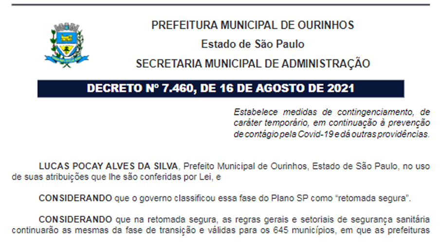 O prefeito de Ourinhos, Lucas Pocay (PSD), seguiu o govenador, João Doria (PSDB) e publicou no Diário Oficial do Município, nesta terça-feira, 17, o novo decreto que estabelece medidas de contingenciamento, de caráter temporário, em continuação à prevenção de contágio pela Covid-19 e liberou todas as atividades econômicas (aquelas já liberadas) a funcionar, com atendimento presencial sem restrição de horário e com sua capacidade de 100%. Porém continua proibido a realização de shows e eventos com público em pé, pistas de dança e torcida. O som ao vivo é permitido, mas pessoas não podem ficar em pé, somente em suas mesas, ou seja, sem dançar e aglomerar.O uso de máscara, o distanciamento mínimo de um metro e a adesão aos protocolos de higiene continuam obrigatórios para qualquer evento ou estabelecimento. (confira o decreto completo abaixo)