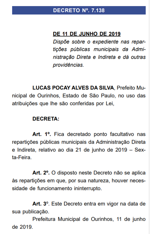 O prefeito de Ourinhos, Lucas Pocay, publicou no Diário Oficial do Município, desta sexta-feira, 14, o decreto nº 7.138 “ponto facultativo nas repartições públicas municipais da Administração Direta e Indireta, relativo ao dia 21 de junho de 2019 – Sexta-Feira”.