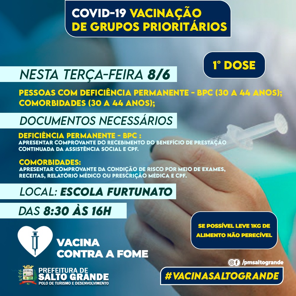 A Prefeitura de Salto Grande em conjunto com o Departamento de Saúde realizará nesta terça-feira 8/6, mais uma etapa de vacinação contra a covid-19.