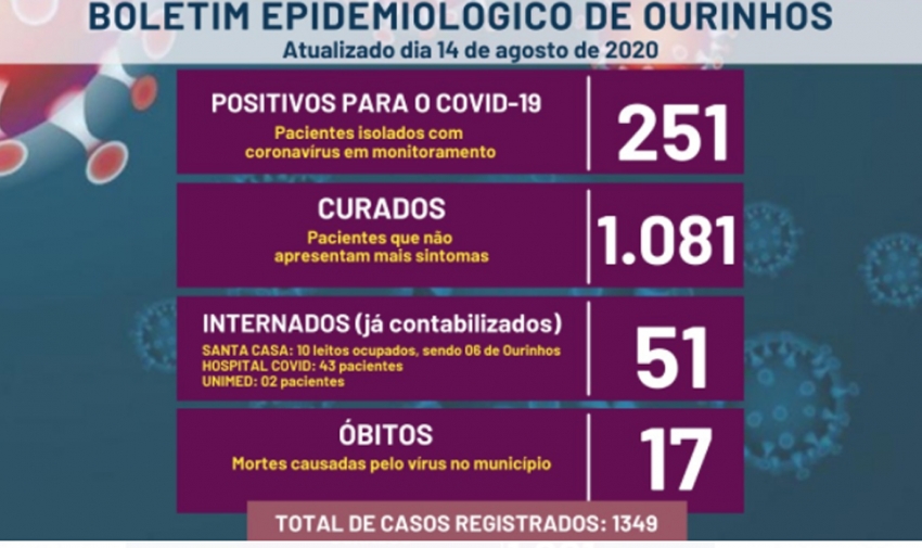 Levando em consideração os dados de positivos, curados e óbitos, a cidade contabiliza 1.349 casos notificados.