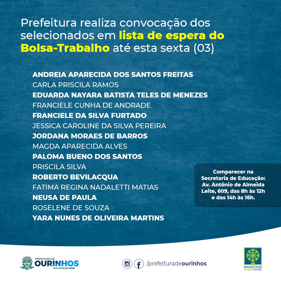 Prefeitura de Ourinhos, em trabalho coordenado pela Secretaria Municipal de Desenvolvimento Econômico, Trabalho e Turismo, divulga a lista da 2ª Convocação do Bolsa-Trabalho, referente as vagas remanescentes do Edital SDE/CPER nº 01/2021, publicado nesta quarta-feira (01), no Diário Oficial do Estado.