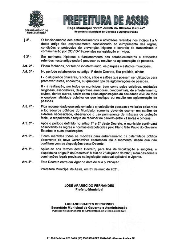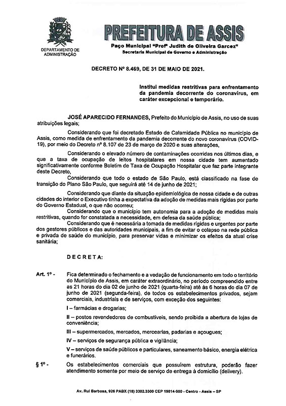 A Prefeitura da cidade de Assis (70 km de Ourinhos) publicou nesta segunda-feira, 31, um decreto estabelecendo medidas de contensão contra à Covid-19 e estabeleceu o fechamento de atividades econômicas, a partir das 21h da próxima quarta-feira, 2, véspera de feriado de Corpus Christi, até às 6h de segunda-feira, 7 de junho. O decreto permite apenas a abertura dos serviços considerados essenciais, como: supermercados, farmácias, postos de combustíveis (lojas de conveniências estão proibidas, exceto no sistema delivery), padarias, mercearias, além de serviços de saúde, segurança, saneamento, energia elétrica e funerário.
