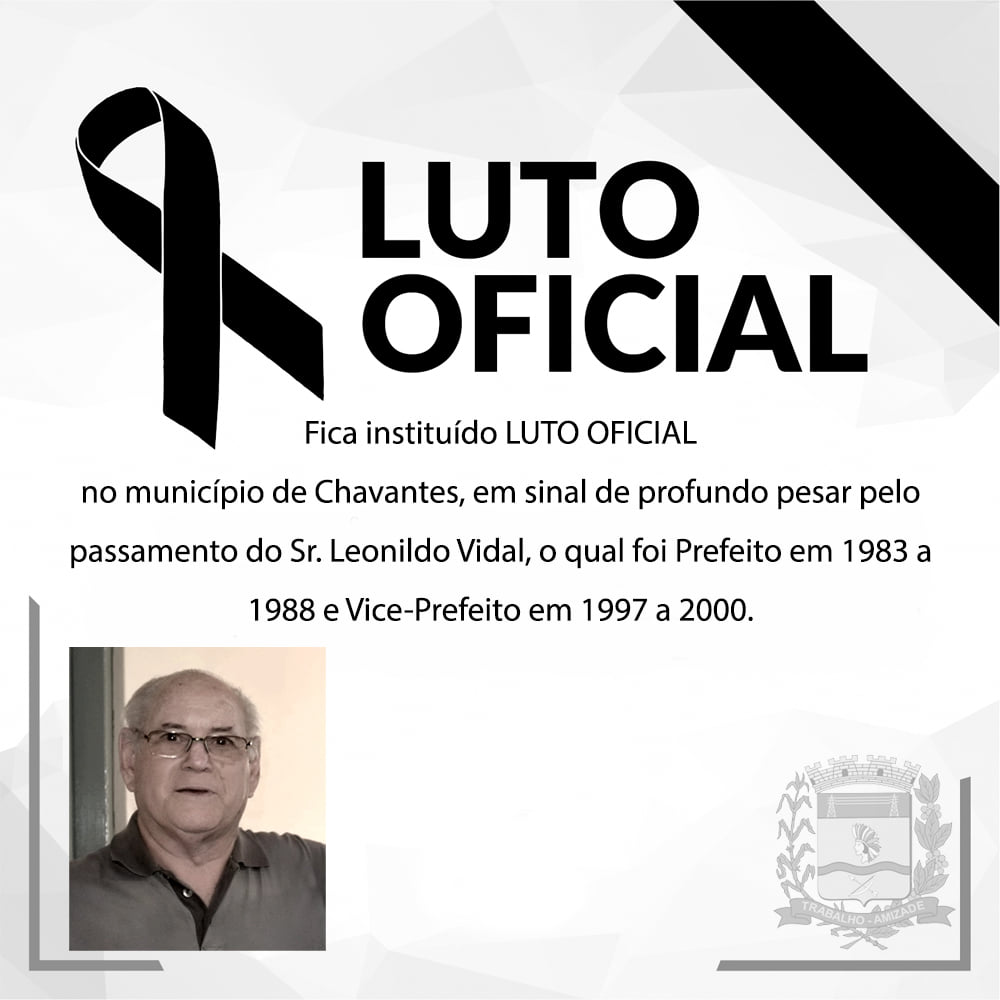 A Prefeitura de Chavantes instituiu, na manhã desta sexta-feira, 30, luto oficial na cidade, em homenagem ao ex-prefeito Leonildo Vidal, que faleceu hoje (30) em decorrência de um AVC (Acidente Vascular Cerebral). Leonildo foi prefeito de Chavantes de 1983 a 1988 e vice-prefeito de 1997 a 2000. Confira a nota divulgada pela Prefeitura de Chavantes: